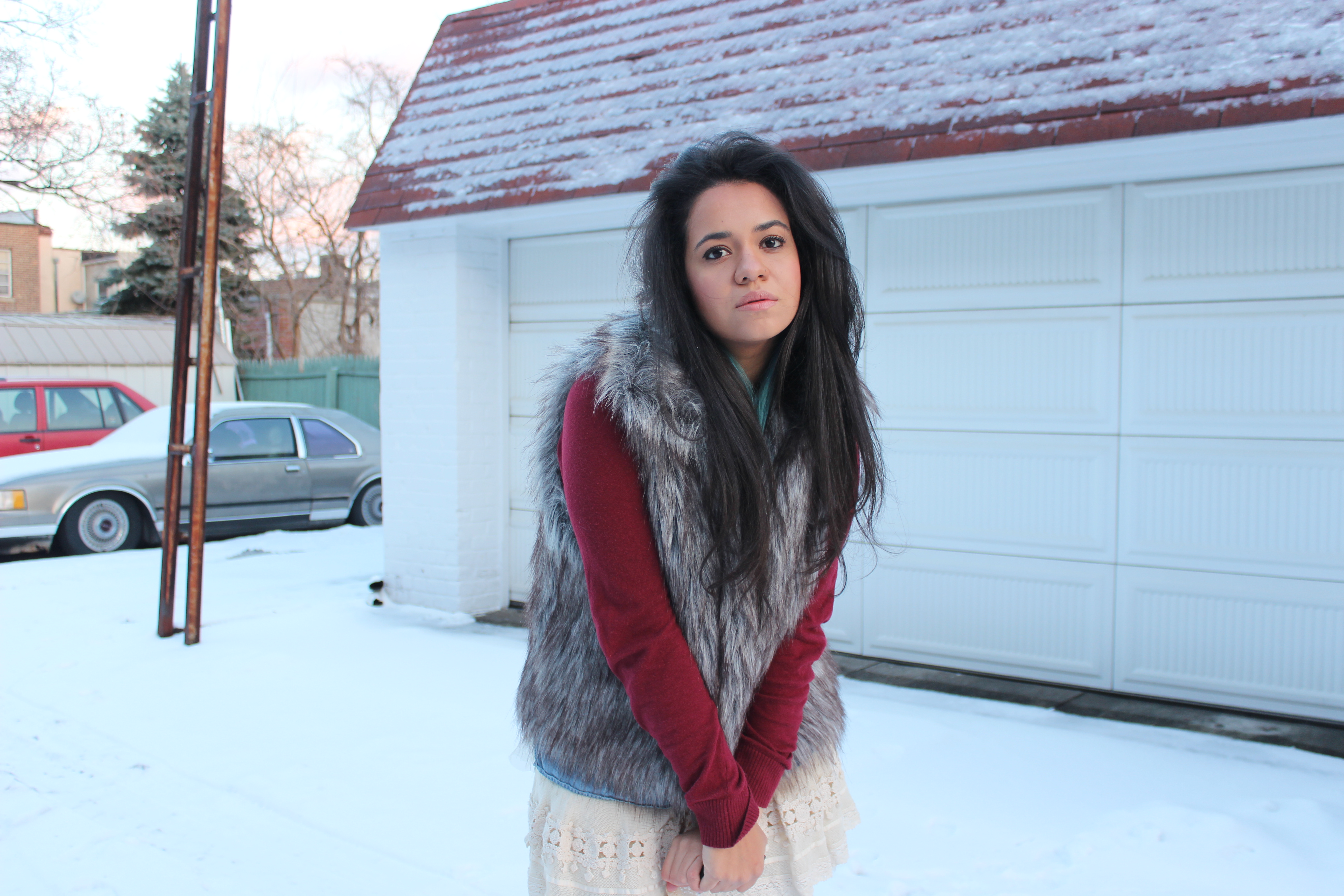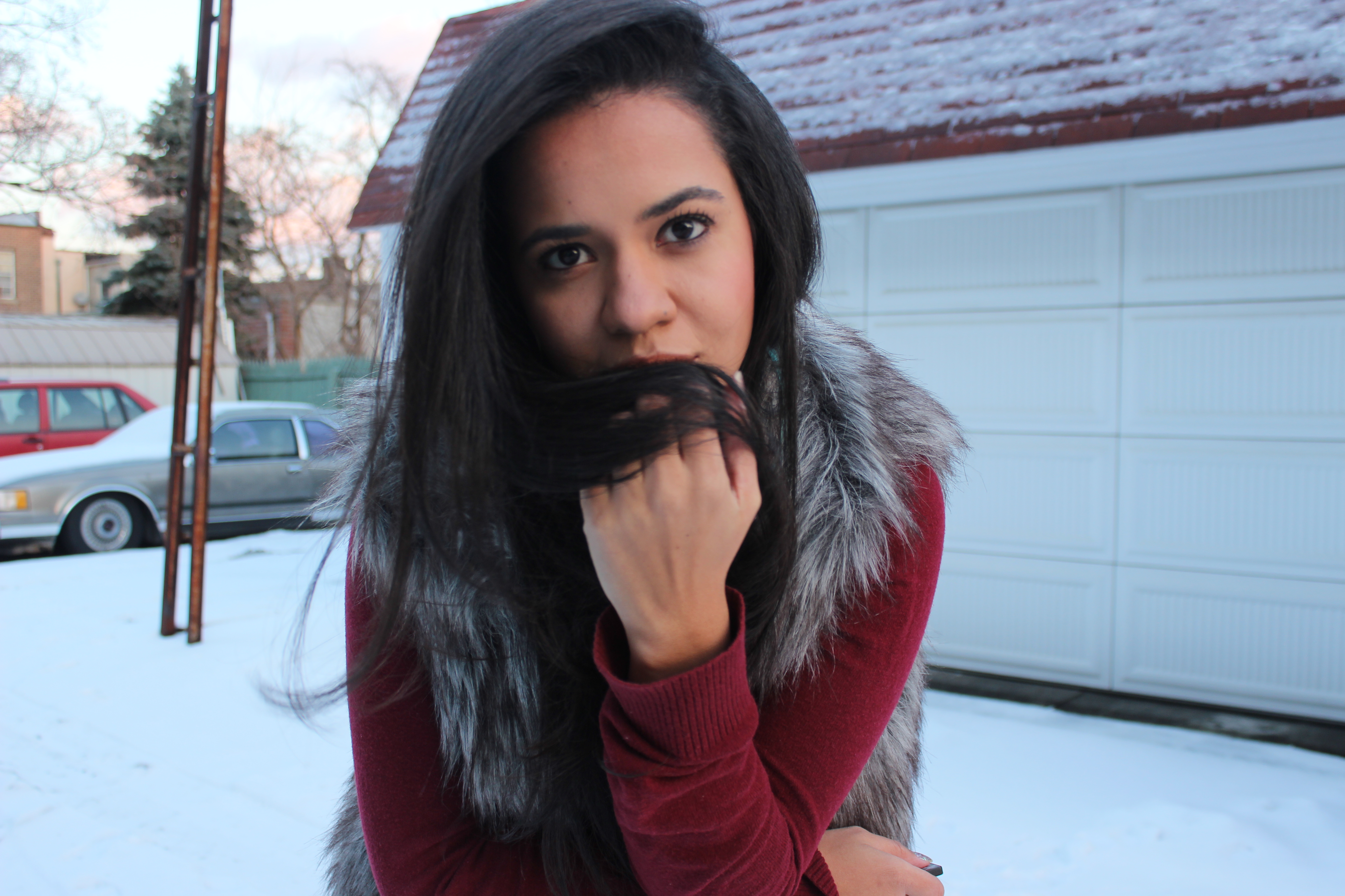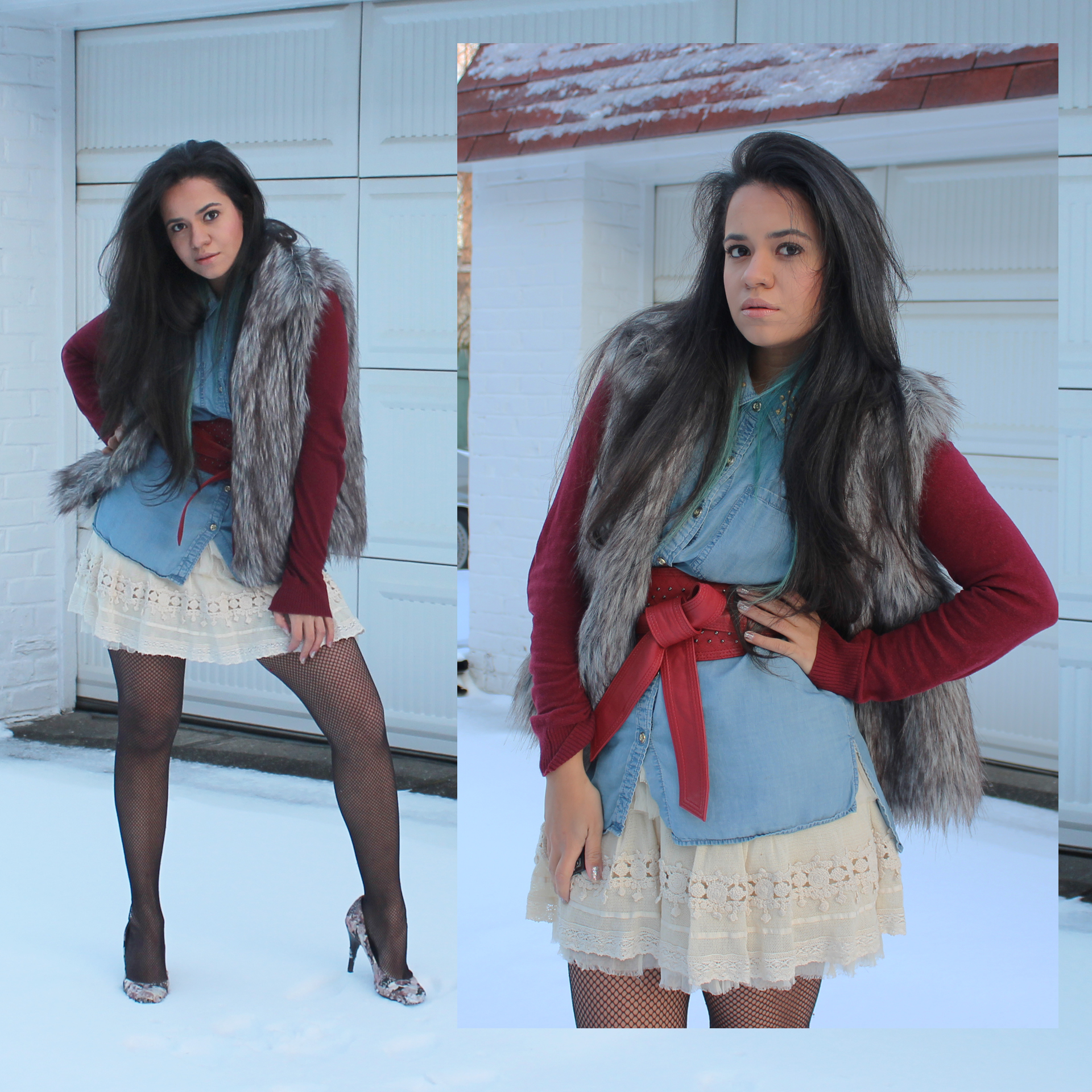 Nas fotos, eu tentei mostrar a magia da neve, como me afeta e as coisas ao meu redor. Eu misturei estilos e roupas de diferentes estações do ano para obter um look sensual. A melhor coisa deste look é o cinto de quimono que o deixou moderno e feminino.
