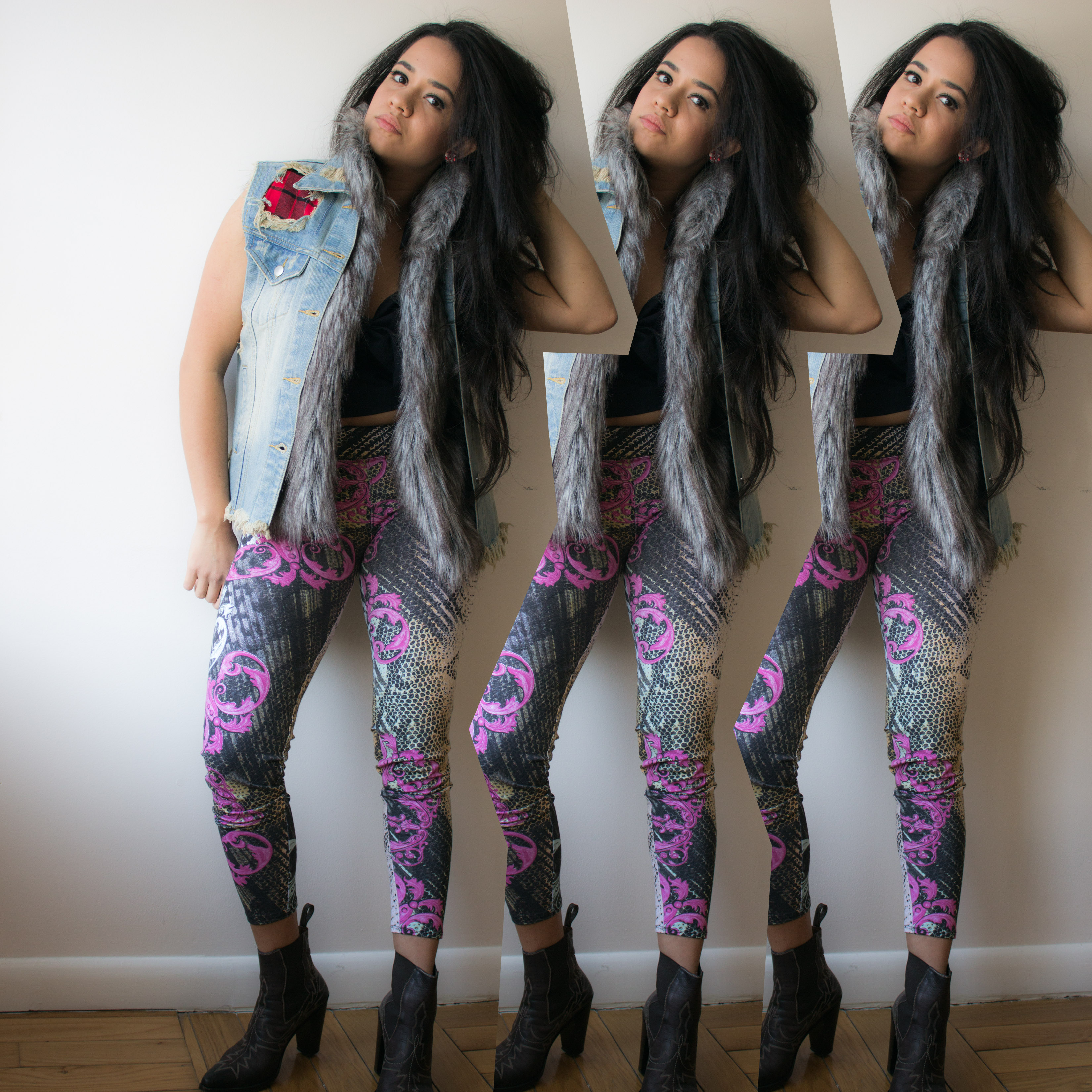 This crazy weather inspired me, and I created this look: mixed colors with Denis and faux fur, a touch of rock and roll from 80’s and finishing it with boots style western. The print pants giving that perfect touch. I got a cool and unique look. I suggest the look to enjoy this spring in New York.